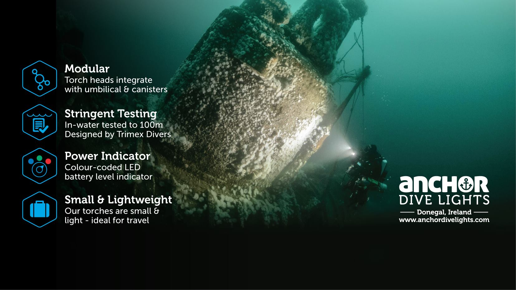 Anchor Dive Lights is the premium dive light brand from Donegal, Ireland. Designed by divers for divers, loving the sea and scuba diving.